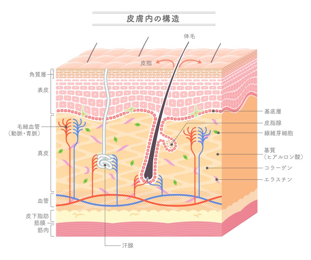 毛細血管を通して酸素と栄養が表皮細胞に送られ、皮膚の新陳代謝機能を活発にしていきます。